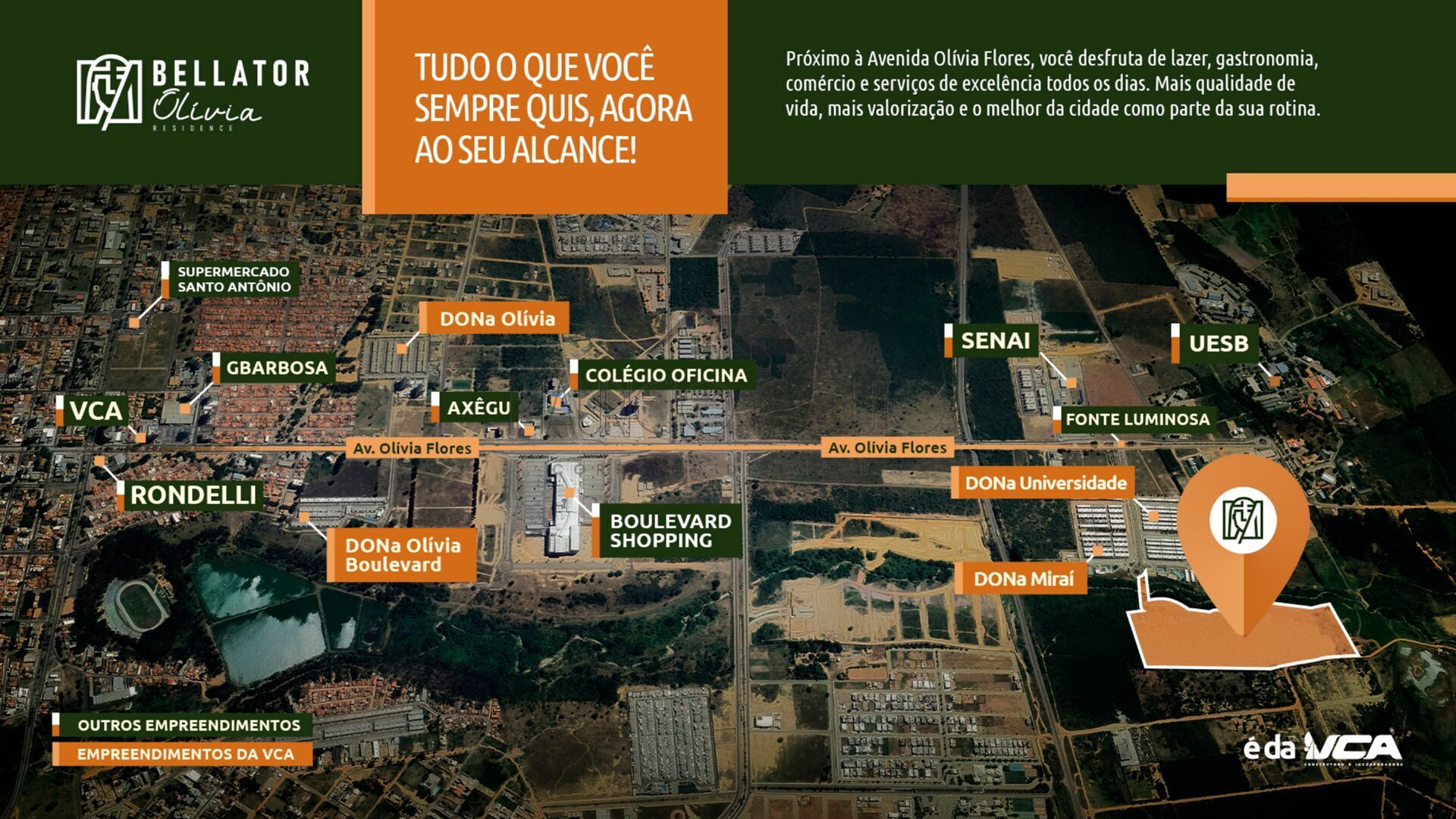 Localizado na região da Avenida Olívia Flores, a mais desejada da cidade, o Bellator chega trazendo modernidade e sofisticação. Além da nova composição arquitetônica e do uso de tecnologias de ponta, o empreendimento contará com uma área de lazer totalmente repaginada. A VCA mais uma vez inova nesses espaços, criando um visual ainda mais impactante e exclusivo, mantendo o alto padrão de lazer que já é marca registrada da construtora.